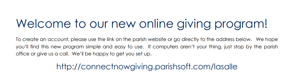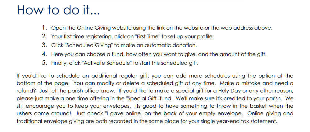 If you'd like to schedule an additional regular gift, you can add more schedules using the option at the bottom of the page. You can modify or delete a scheduled gift at any time. Make a mistake and need a refund? Just let the parish office know. If you'd like to make a special gift for a Holy Day or any other reason, please just make a one-time offering in the "Special Gift" fund. We'll make sure it's credited to your parish. We still encourage you to keep your envelopes. Its good to have something to throw in the basket when the ushers come around! Just check "I gave online" on the back of your empty envelope. Online giving and traditional envelope giving are both recorded in the same place for your single year-end tax statement.