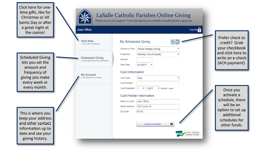 Making a regular online contribution by electronic check or credit card is easy with our new system:
